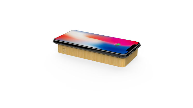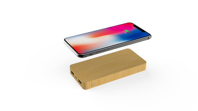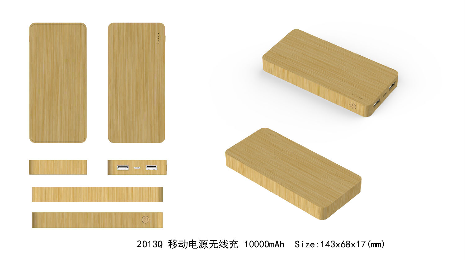 Material: Bamboo Product size:143*68*17mm Weight:233.5g Battery type:1260113 Li-polymer 10000mAh Micro input:5V/2A USB A output1/2: 5V/2A Wireless output:5W