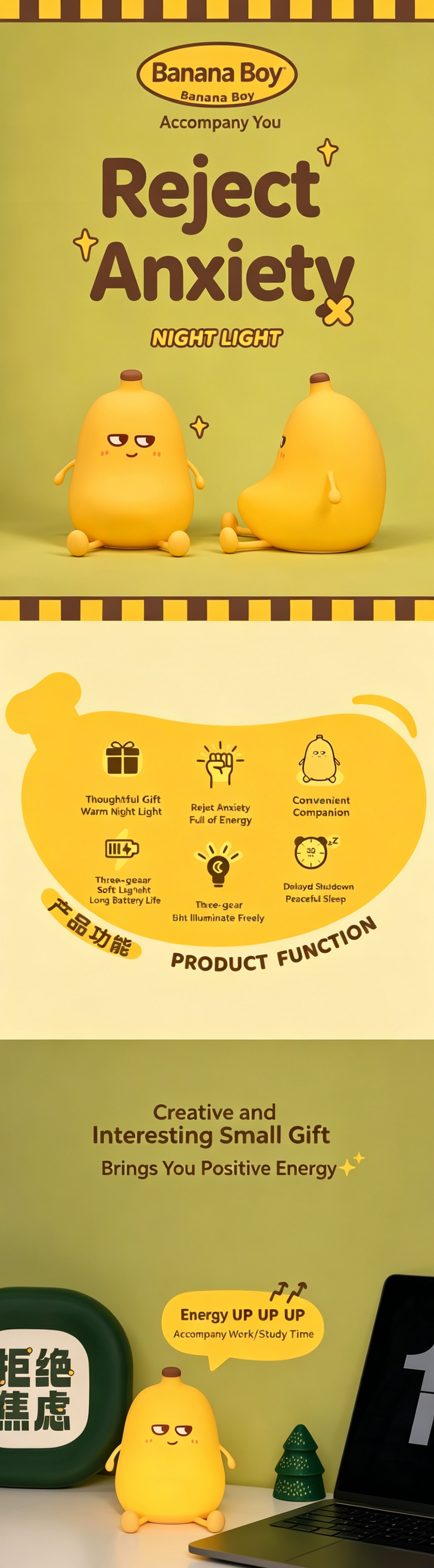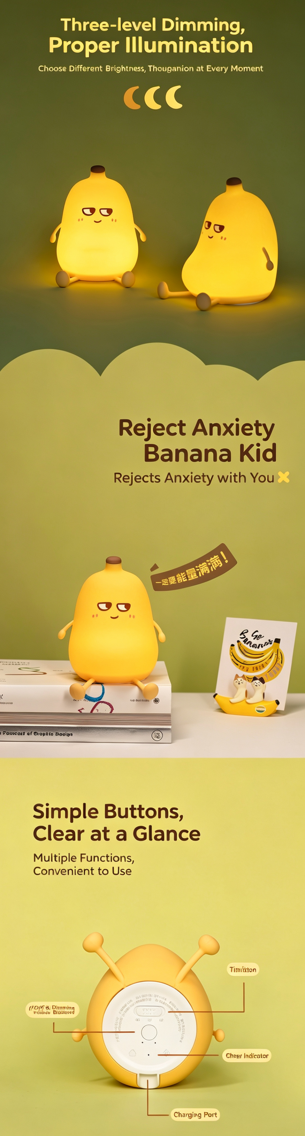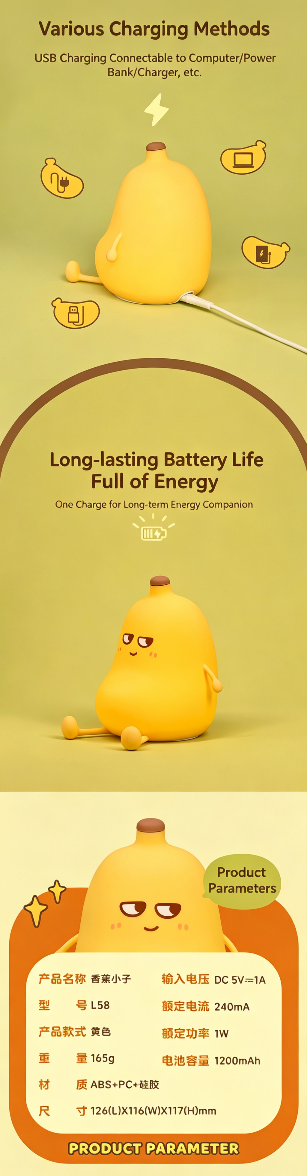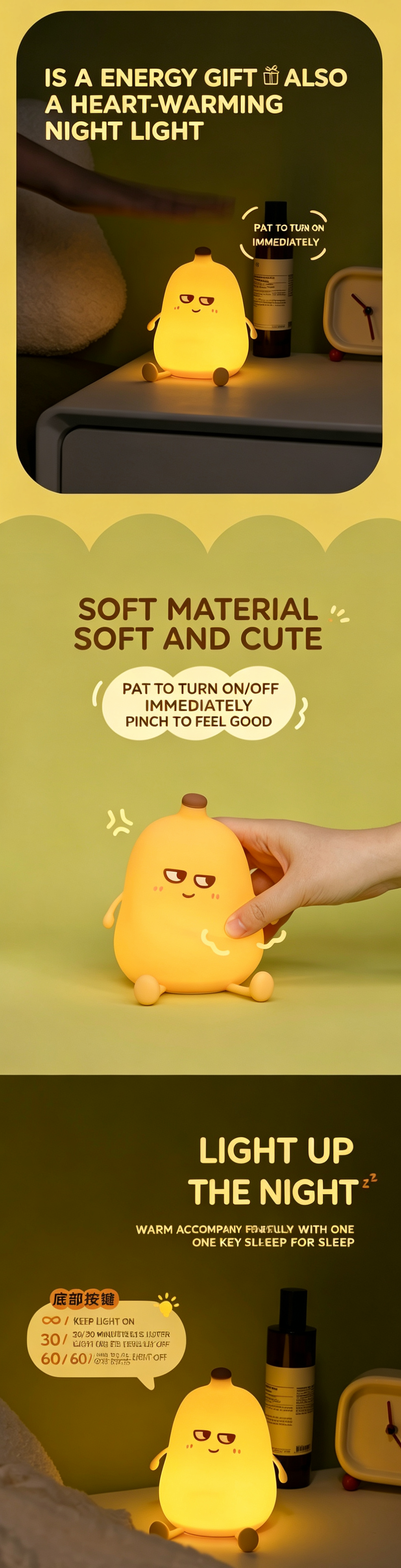 Adorable yellow banana-shaped silicone night light, blending cute design with practical functions. Soft, safe, and squeezable, it serves as a bedside lamp, stress-relief toy, and thoughtful gift, bringing cozy comfort and positive energy to nurseries, bedrooms, and desks.