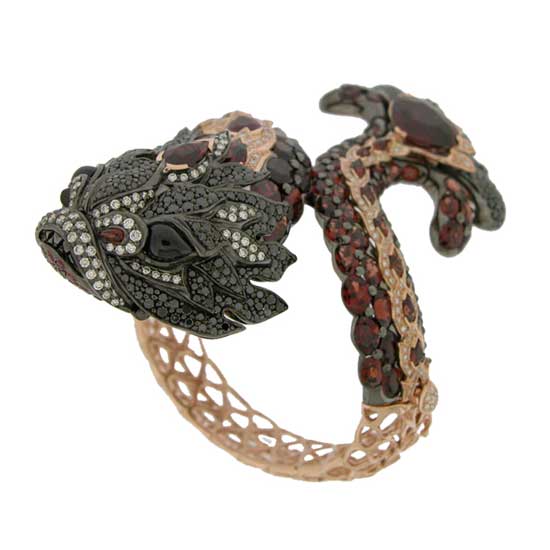 This featured bangle comes in a design that appreciates the Chinese art. The dragon design is made unique with the employment of various colored diamonds, spinel, 18K gold and 925 silver. This complicated and exquisite design is interpreted through the most skillful hands with utmost attention to details.