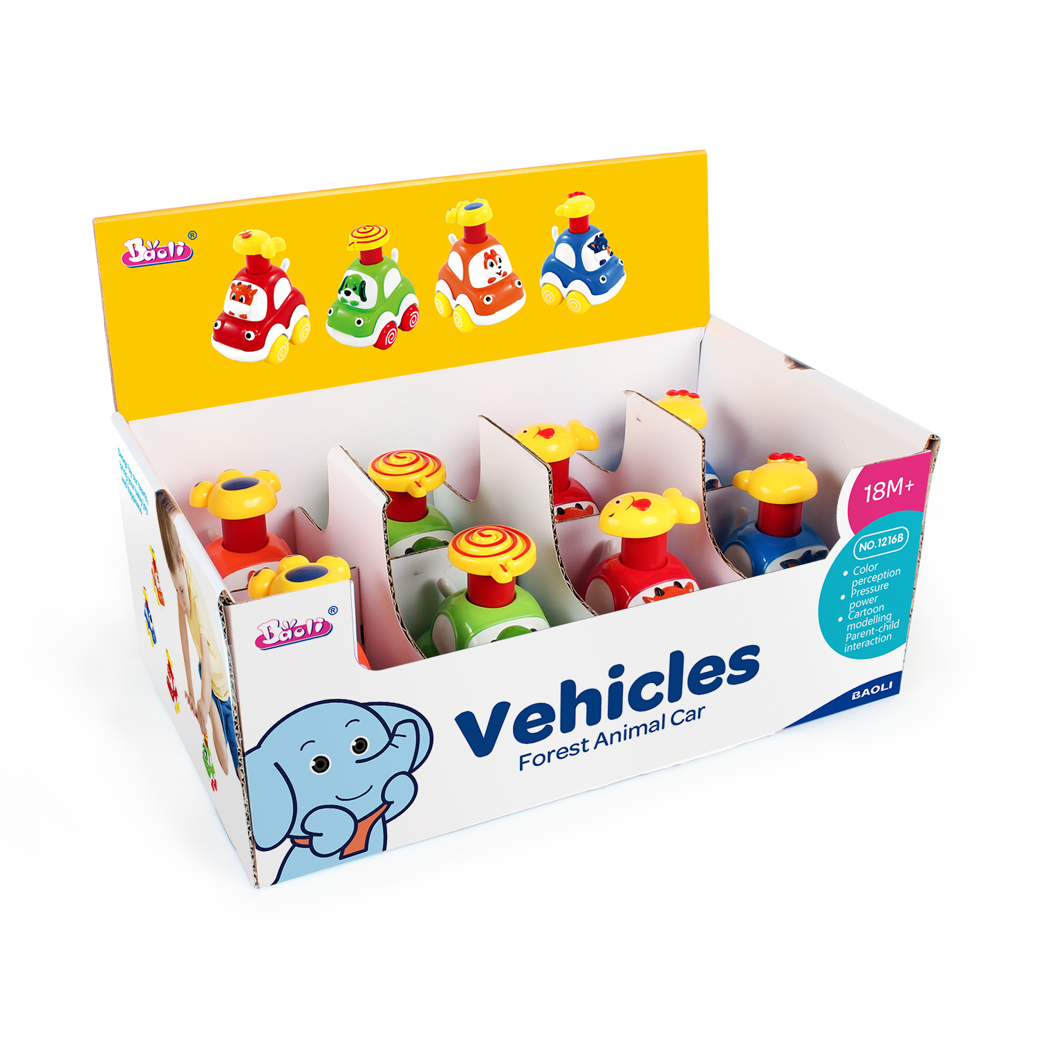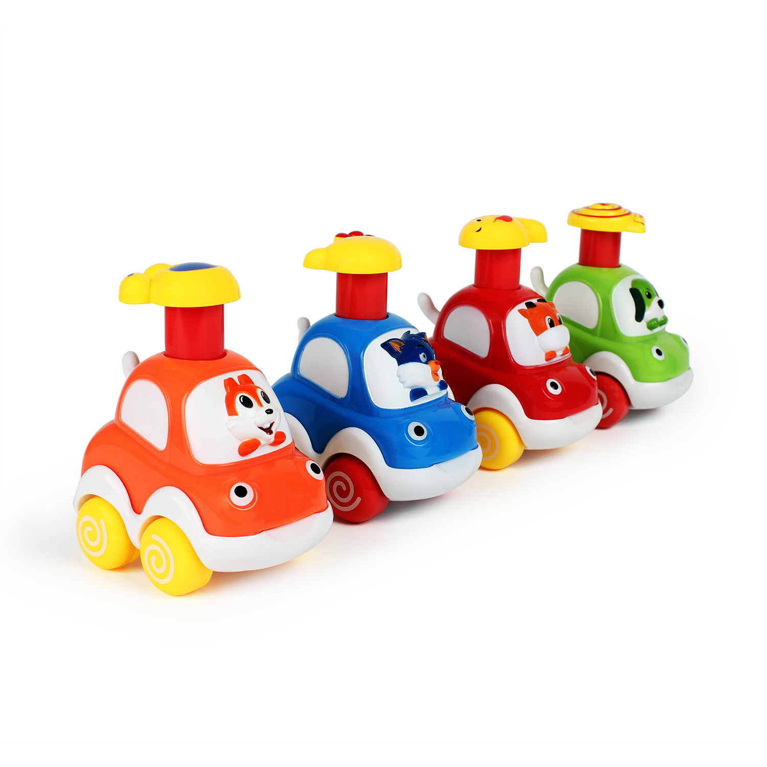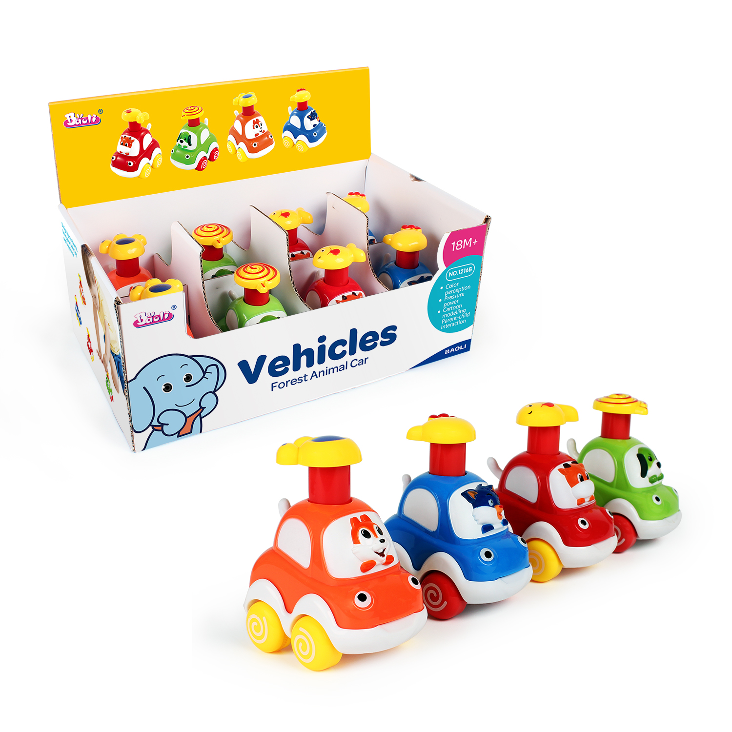This push-and-go cartoon car is a fun and vibrant toy that encourages physical play and motor skills development. With its cute, colorful design and easy-to-push action, this toy will bring hours of entertainment and promote active play for toddlers.