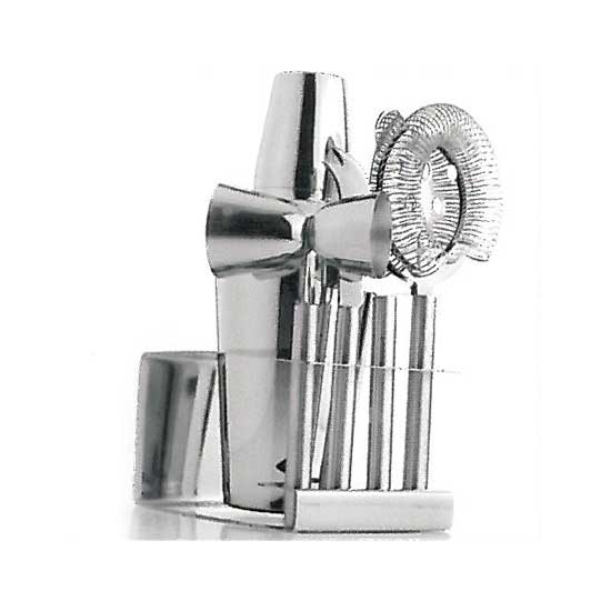 Shown here is a high-quality bar accessory set that is made of durable stainless steel material. This excellent set comes with a cocktail shaker and associated bar accessories. This fine bar accessory set makes the perfect addition to your collection.