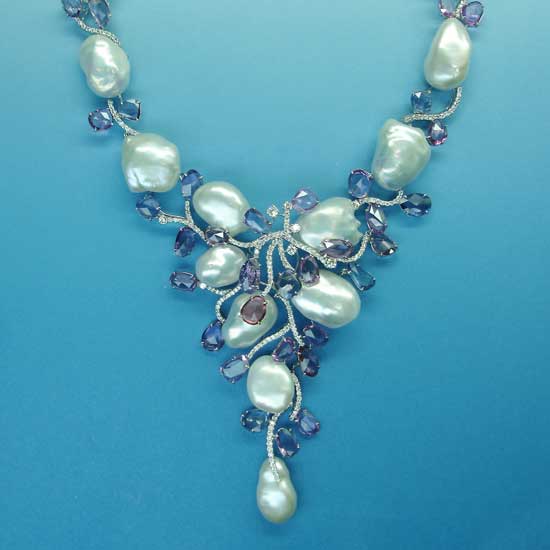This gorgeous necklace features lustrous white baroque pearls set in 18K white gold. The necklace is also adorned with faceted blue stones and tiny white diamonds. The tasteful necklace will enhance the beauty of any wearer.