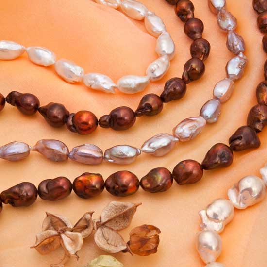 Highlighted is a collection of baroque pearls featuring natural irregular shapes. The pearls boast nice white or chocolate colors with beautiful luster. The unique appearance of the pearls makes any jewelries one of a kind.