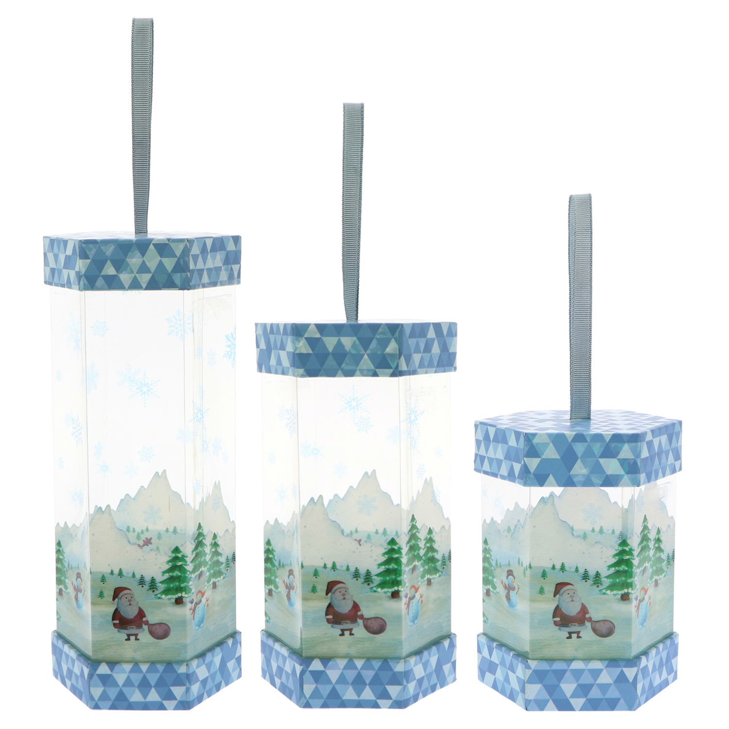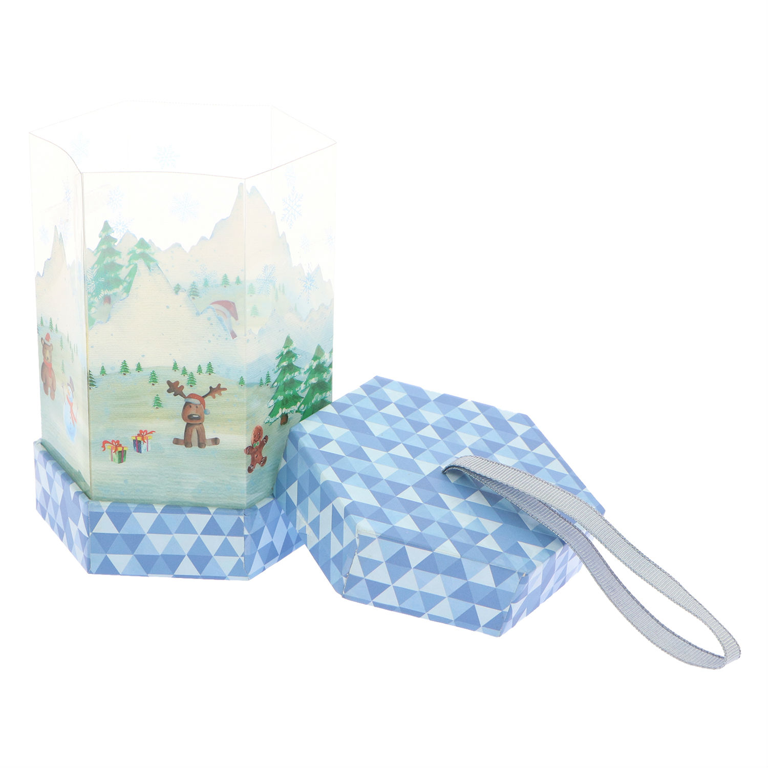 Match your gifts with a Christmas theme by packaging them with this hexagonal barrel box. It has a clear acetate barrel printed with Christmas themed artwork and has a paper lid and base. This hexagonal barrel box offers a good view of the gift inside and has a ribbon on top for carrying and hanging.