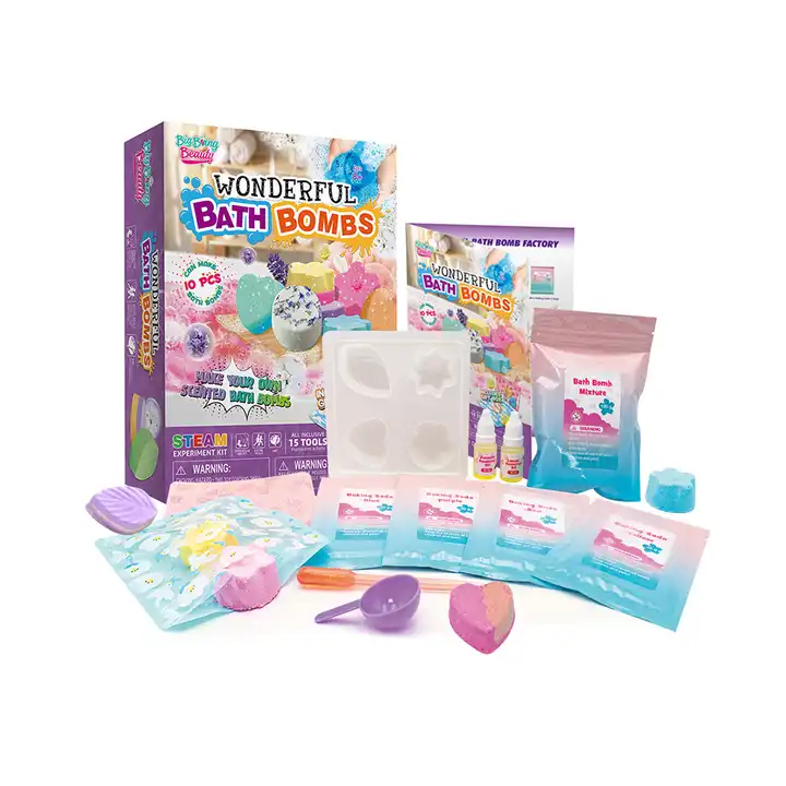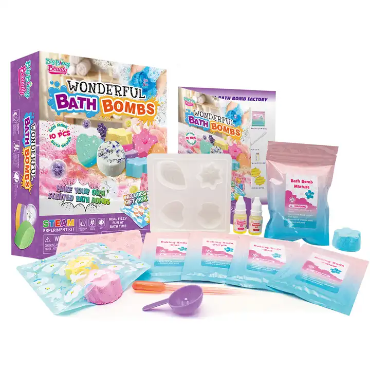 Create 10 of your own sparkling bath bombs and learn the science behind the fizz with Wonderful Bath Bombs kit! This DIY bath bomb kit has everything you need to transform bath time into an out-of-this-world experience. Work like a real cosmetic scientist as you follow the fully-illustrated instructions to mix up your ingredients and fill the bath bomb molds with colors, lemon or jasmine scents! Once your custom creations are complete, watch acid and base chemistry in action as you drop your galactic bath bombs in the tub for a stellar color show!