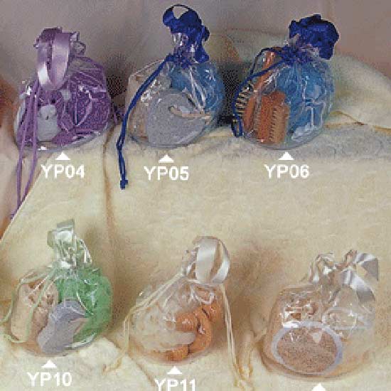 These bath gift sets have different contents. They are packed by graceful pouches with drawstrings and ribbons. Each set includes a bath sponge and other items like a stuffed toy. The sets make pleasant gifts.