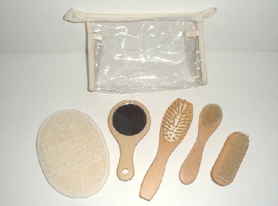 S-4 bathing set included :Loofah pad, Hair brush, Facial brush, Mirror, Nail brush & PVC bag