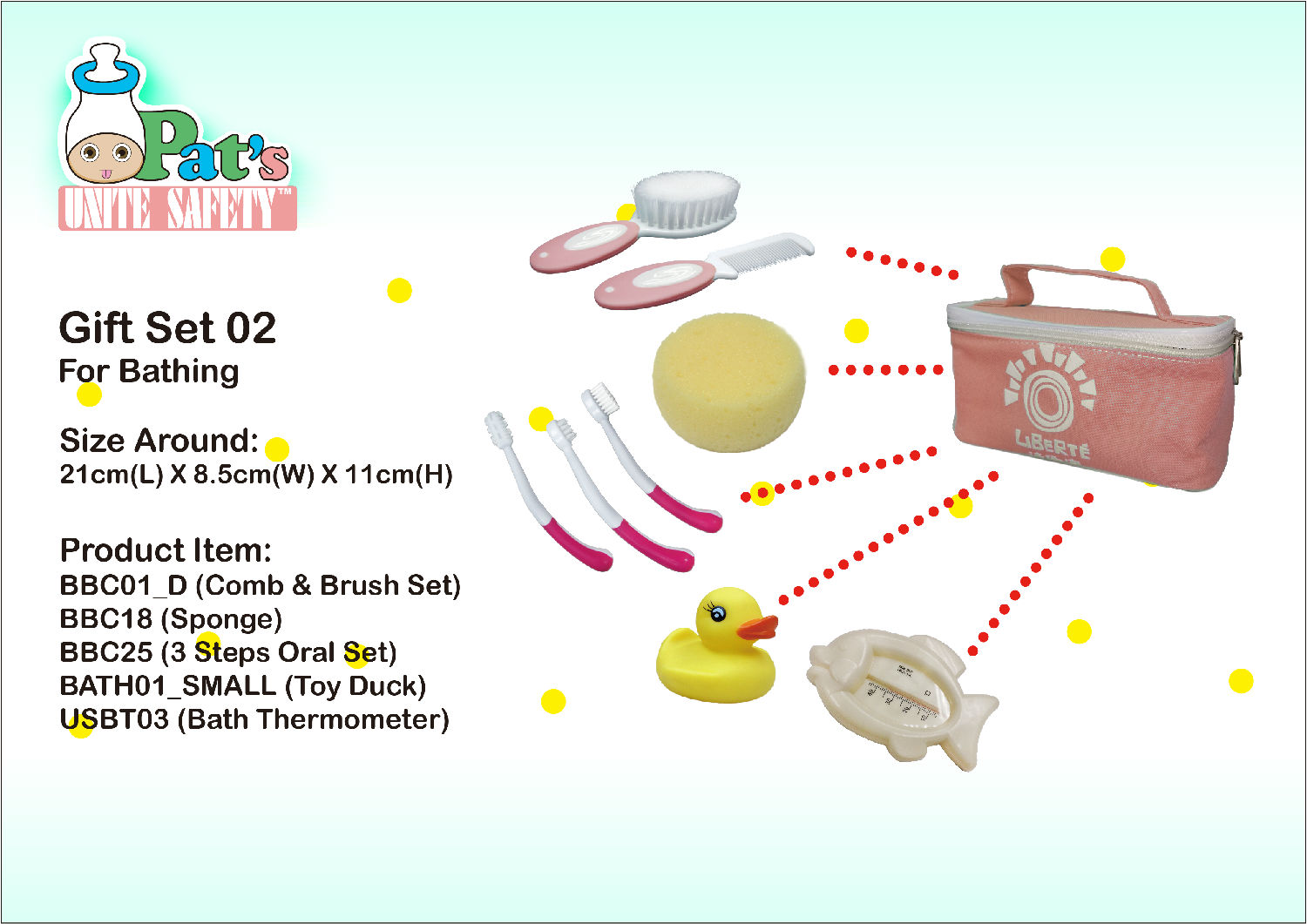 the gift set is for parents take away with child. it can take good care and every possible protection for your baby. compact design, easy collection, eco-friendly. gift set 2 for bathing, total 5 items included:- pis item no.: bbc01_d comb / brush set ( double injection ) size: brush - around 5 x 14.2 x 2.5cm comb - around 3 x 13.7 x 0.9cm set of 2 pis item no.: bbc25 3 steps oral set size : around 13.5 x 2.5 x 1.5cm ( lxwxh ) set of 3 pis item no.:bbc18 bath sponge size : diameter around 9cm / high 4cm set of 1 pis item no.: usbt03 bath thermometer fish shape w / pvc mirror +/- 2c tolerance size: around 13(l) x 8.7(w) x 1.5(h) cm set of 1 pis item no.: bath01_small bath toy (duck shape) size: 7.5(w)x7.5(l)x5.5cm(h) set of 1 packaging: each pc pack in one hang bag size around: 21cm(l) x 8.5cm(w) x 11cm(h)