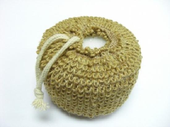 The highlighted bathing sponge features a soft white texture. The bathing sponge has a drawstring jute bag for storage. By using the bathing sponge, you can gently cleanse your skin and make it soft.