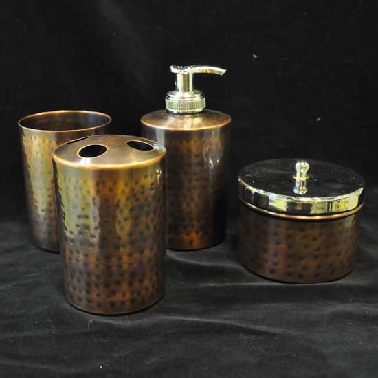 Showcased is a classy bathroom accessory set that gives out a sense of subtle brilliance. This fine set comes with a tooth brush holder, a container, a liquid soap dispenser and a cup that are made of metal material. This excellent set is the definitive gift for flair of uniqueness.