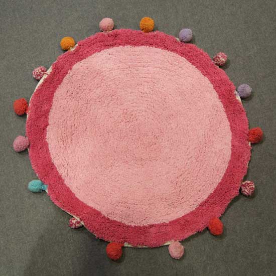 This stylish bathroom mat features a pink circle design. It is accented with colorful plush balls along the rim for added flair. The cotton bathroom mat will create texture and warmth and provide comfort over your bathroom floor.