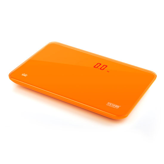 This pictured bathroom features a slim and sleek design in an eye-catching orange. The stylish piece is equipped with a high-precision strain gauge sensor system for accurate readings. The readings are displayed in digital format with colorful LEDs.