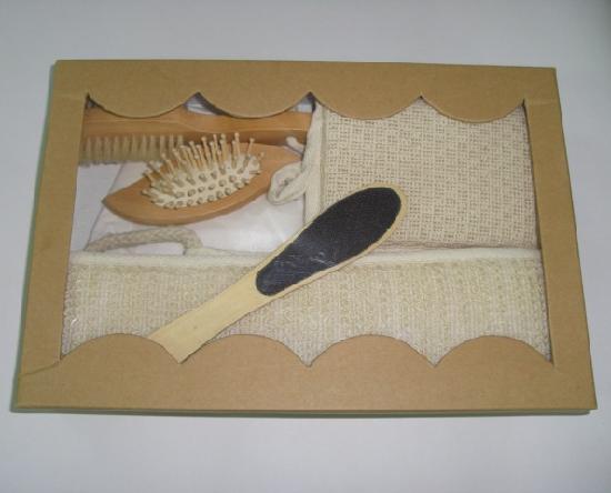 - Include a wooden hair brush, a wooden nail brush, a wooden foot file, a body sponge and a ramie back strap.