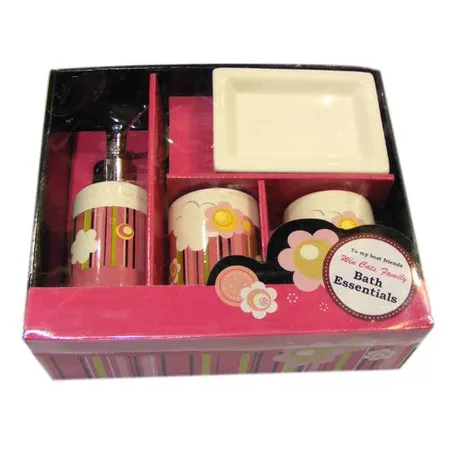 This set of bathroom accessories is best for girls. It includes two cups, a hand soap and a small disk. They feature beautiful flower patterns. Using this set, you do not have to find each item one by one, and, thus, save a lot of your time.