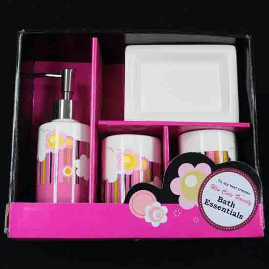 This beautiful bathroom set includes a lotion pump, a soap dish, a toothbrush holder and a tumbler. They boast pink stripe and floral patterns all over. This gorgeous bathroom set makes a great gift idea.