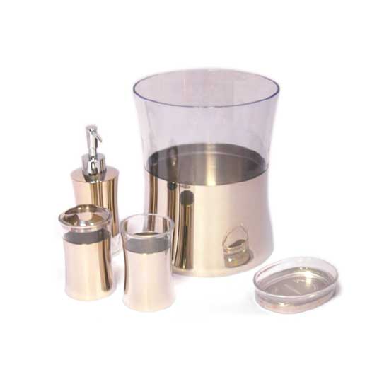 This bathroom set includes a waste bin, a tumbler, a liquid soap dispenser, a soap dish and a toothbrush holder. The stainless steel construction ensures high durability for a long service life. This elegant bathroom set is ideal for brightening up your bathroom.