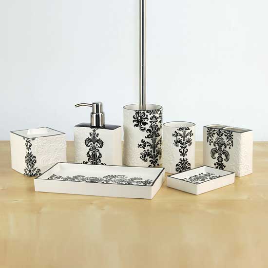 This seven-piece bathroom set features delicate black filigree motifs on white ceramic bodies. The tasteful bathroom set is ideal for households and hotels. The quality ceramic bathroom set is durable and easy to clean.