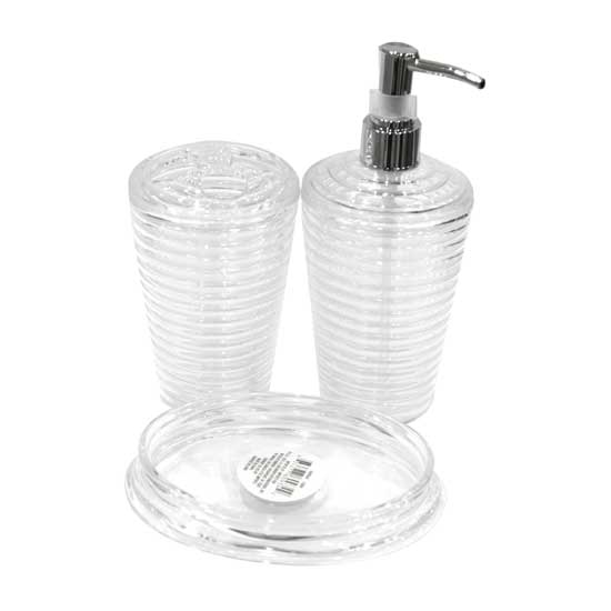 This bathroom set includes a liquid soap dispenser, a toothbrush holder and a soap dish. With a fresh contemporary design, the set adds a unique touch to your bathroom setting. The high-quality bathroom set guarantees a long service life.