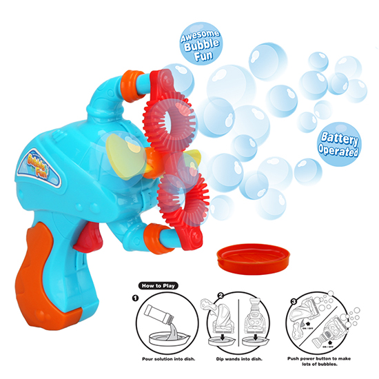 Requires 1 AA batteries (not included) and one 2fl oz. bubble solution with dipping dish (included).
