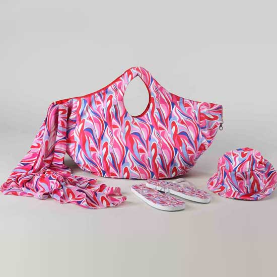 The beach bag set includes a canvas bag, a pareo, a hat and a pair of slippers. The bag features a magnetic closure on top. These beach items showcase delicate abstract prints in a fuchsia color for an attractive style.