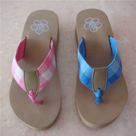 This is a pair of sandals with striped straps in fabric and PU leather.