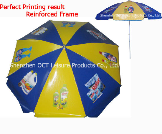 Reinforced beach umbrella with thick PVC cover.
