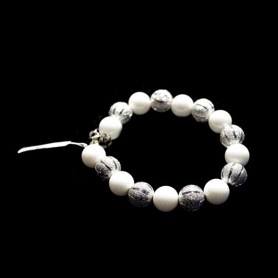 This bracelet boasts a simple beaded design. It consists of shimmering silver and white glossy ceramic beads. Add a touch of elegance to your look with this refined bracelet.