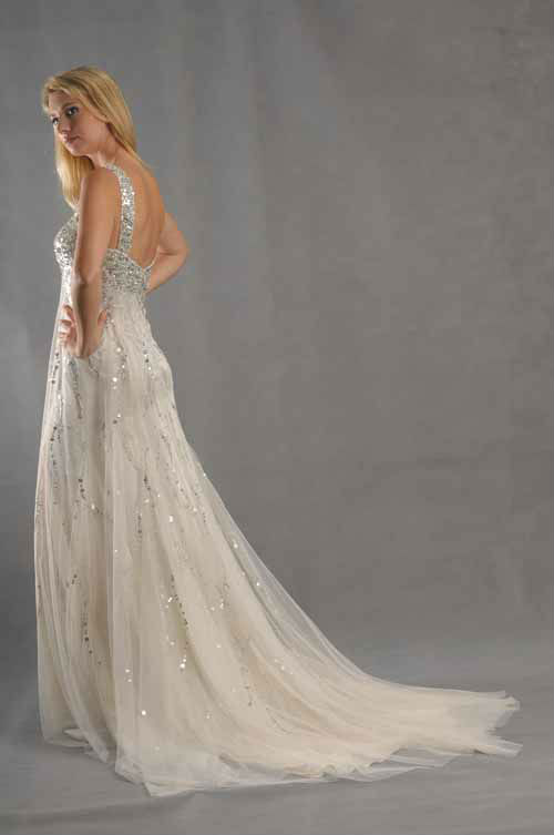 Embrace your happily-ever-after with this gorgeously beaded gown. Shimmering rhinestones sprinkled delicately across your shoulder and down to the swinging hemline to adorn the ivory tulle dress with an unending stream of romantic twinkles. Sheer tulle flourishes down to the floor to round off the exquisite piece with a classic court train design.