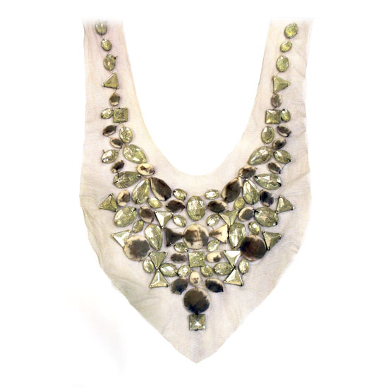 Highlighted is a neck decoration embellished with synthetic stones. The clear stones come in various shapes to create a fabulous appearance. This beautiful decoration is great to add to ladies’ garments.