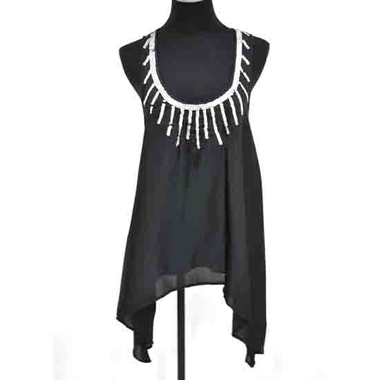 Shown here is a tank top featuring an irregular hem. The top comes in silky black, highlighted by white beads around the neck. The cool design looks chic with any styles of pants or skirts.