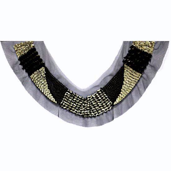The trimming bestows an exquisite design with skilled craftsmanship. The golden and black beads are delicately woven for enhanced style. This trimming is excellent for decorating the collars of various garments.