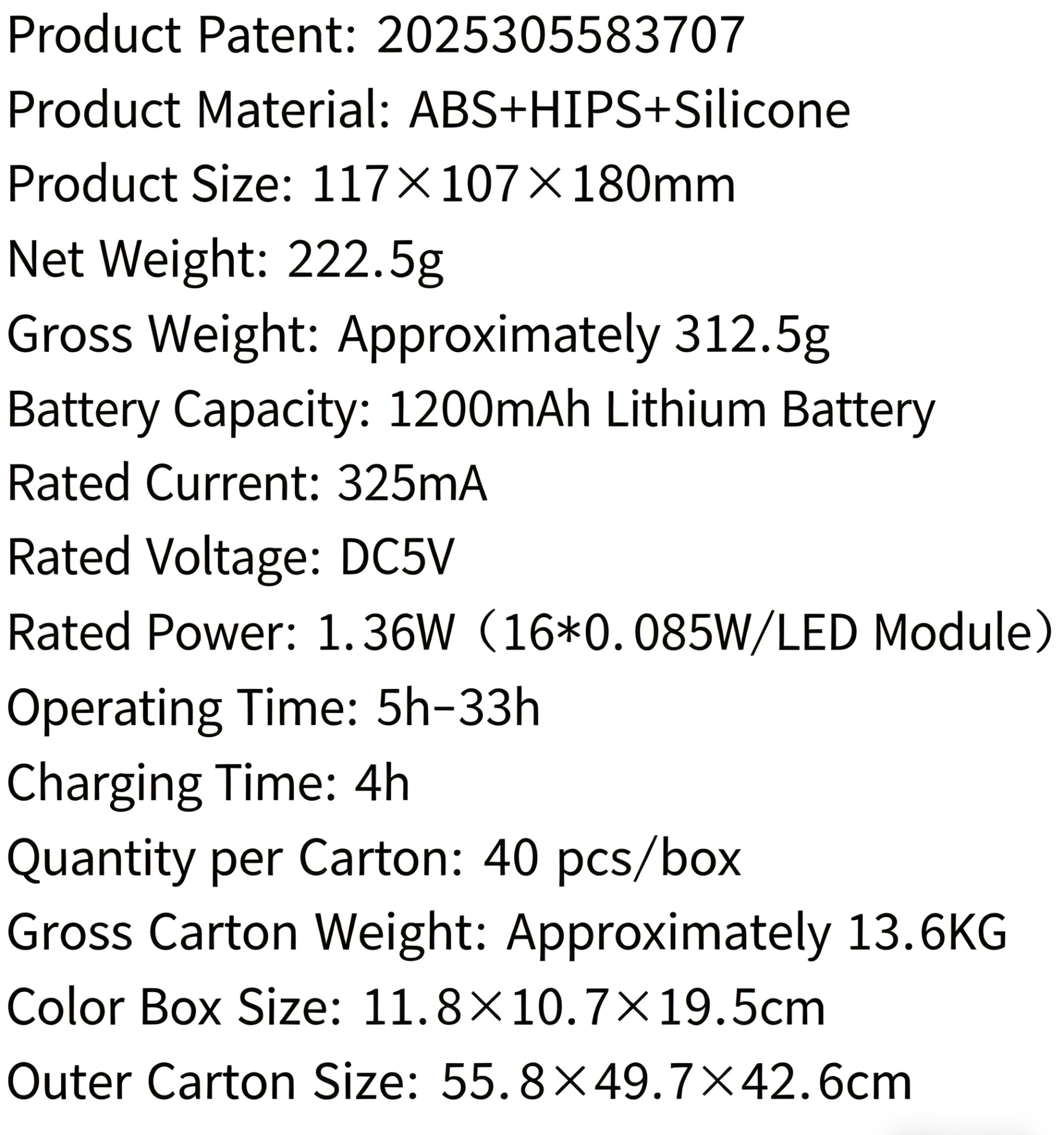 - Working time: 5h (max brightness) to 33h (low brightness). Full charge in 4 hours via USB.