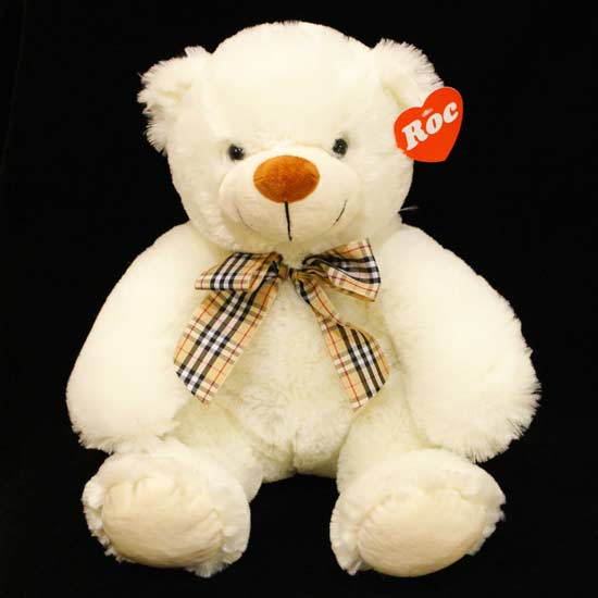 This lovable soft toy features a bear shape with a round head, round hands and round feet, making it more adorable. With its white-colored body, the plush toy gives a sense of pureness. Tied with a checked ribbon around the neck, the bear looks smart. Get this charming bear for your little children.