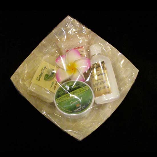This beauty set is made of natural materials and is safe for you to use. It includes a box of body scrub, a bar of soap and a bottle of body lotion. This beauty set is well packed in a transparent bag for added portability.