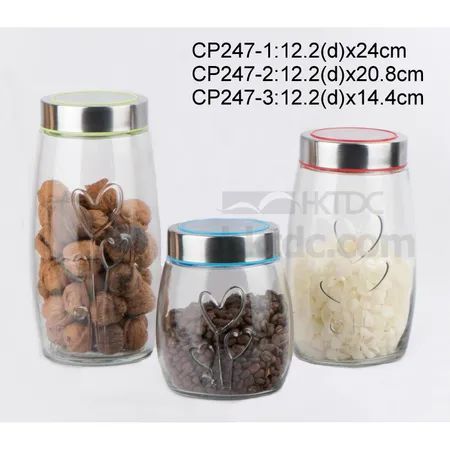 Description: Belly shape glass food jar with stainless steel window lid with embossed heart design