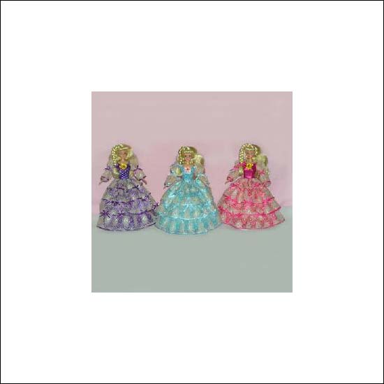 - The toy doll wears classical evening gowns in pink, light blue or purple