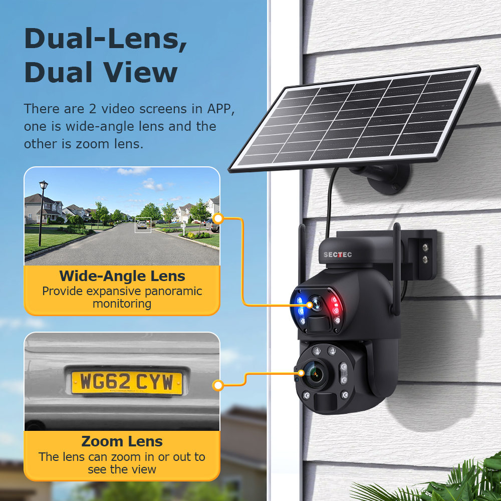 Ultra-wide-angle bullet lens + 36X zoom dual lens delivers two monitoring images and long-distance clarity. Manual horizontal adjustment (up to 350° with bracket); PTZ electric adjustment: 350° horizontally, 90° vertically.