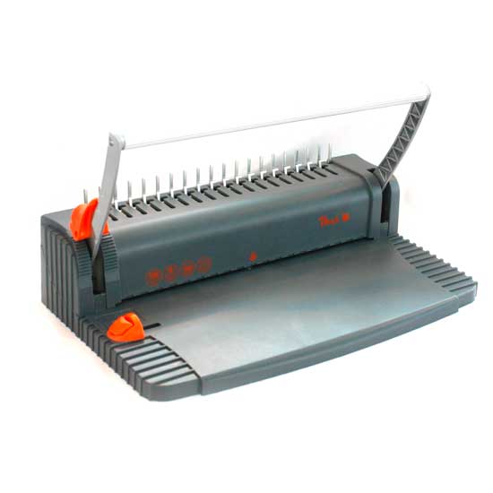 Featured is a binding machine equipped with a stylish and innovative binding system that can handle small to large projects with ease. The binding machine effectively locks pages into place and provides a sleek, slim bound document that lays flat for easy filing and mailing capability.