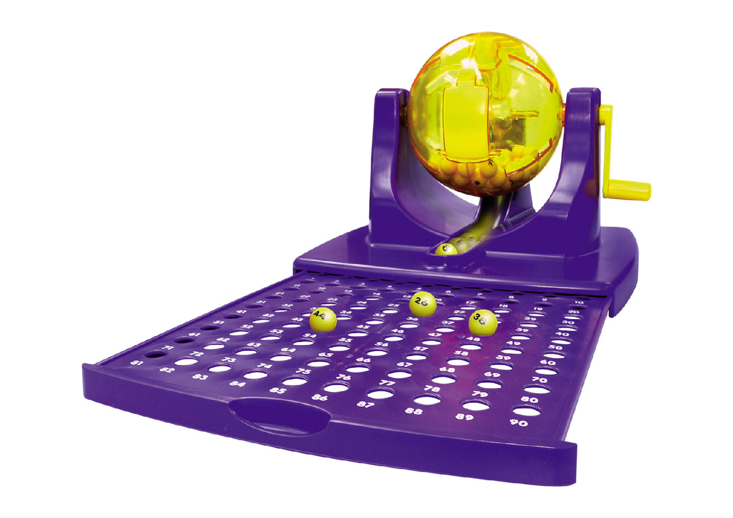 This bingo game has an exterior in blue tone with a numbered board. It has a rotary ball drawer in transparent yellow with a handle on the side. The set is what you need for a fun night of bingo.