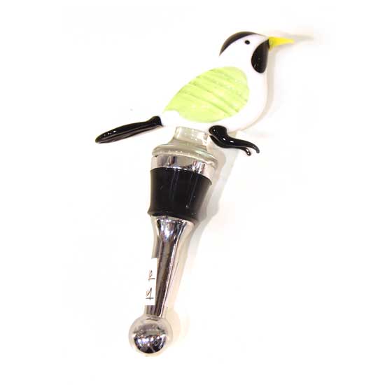 Displayed is a bottle stopper coming with a bird decoration resting on the top. Delicate craftsmanship bestows the glass bird a chic and sleek appearance. This bottle stopper makes a unique decoration on your bottle.