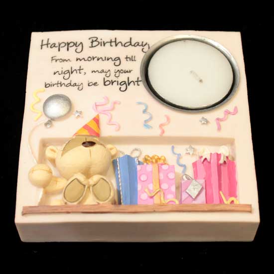 Showcased here is a candle holder that is specially designed for birthday celebrations. There is the pattern of a bear on the holder and there are gifts around the teddy. "Happy Birthday" is also printed on the candle holder.