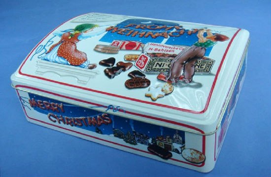 As shown is a tin box with unique shape which can contain biscuit, chocolate, etc.