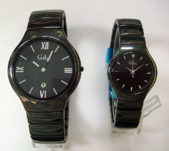 Highlighted is a pair of ceramic watches in all-black design. With Swiss movement, the watches are of high quality and accuracy. The men's watch dial features roman numerals at three, six, nine and twelve o'clock while stick markers for other numbers. Both watches are water resistant and so are great partners for water sports fans.
