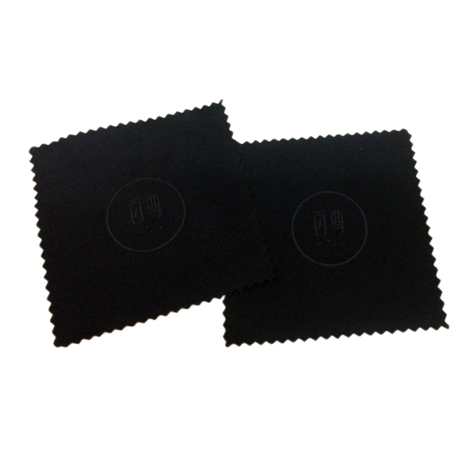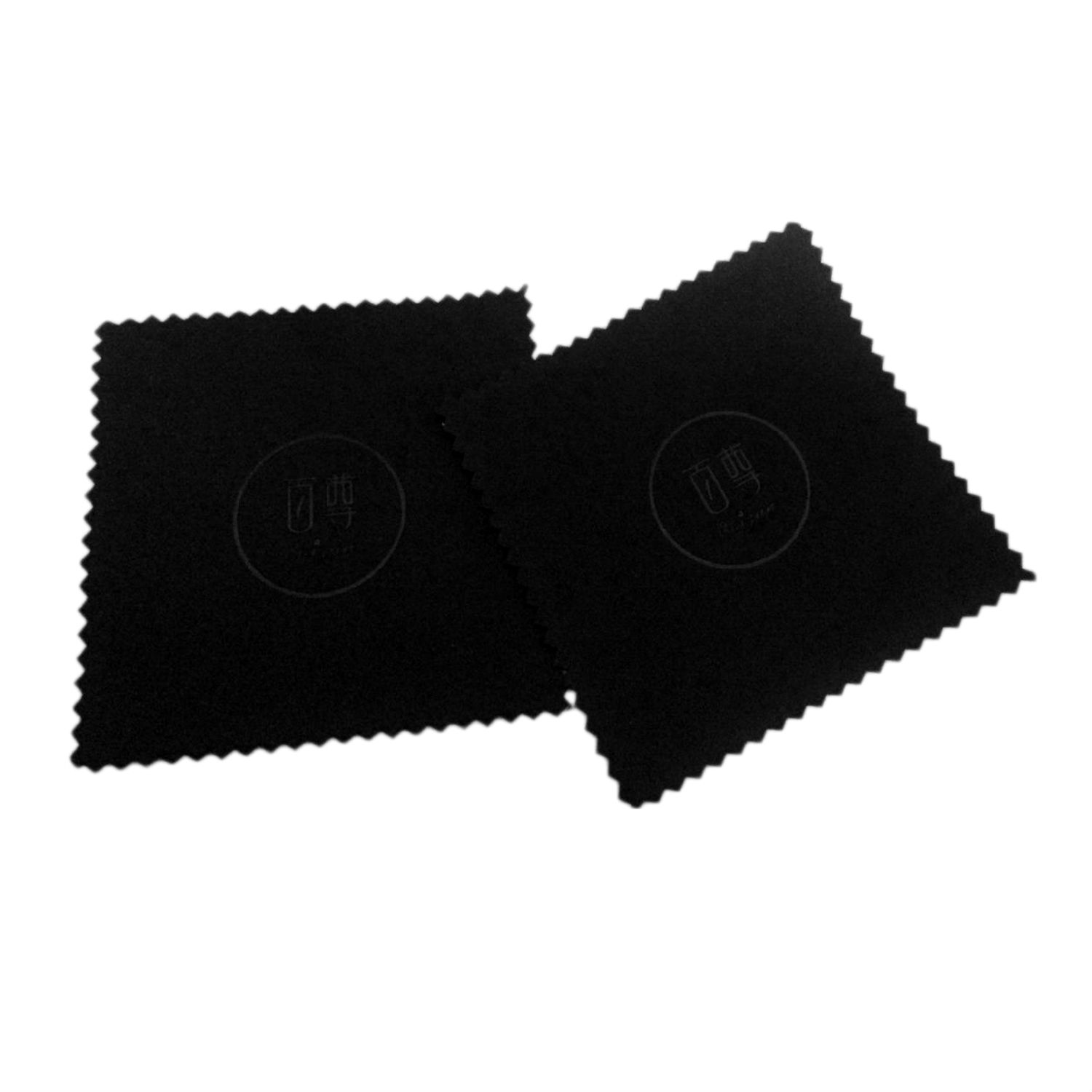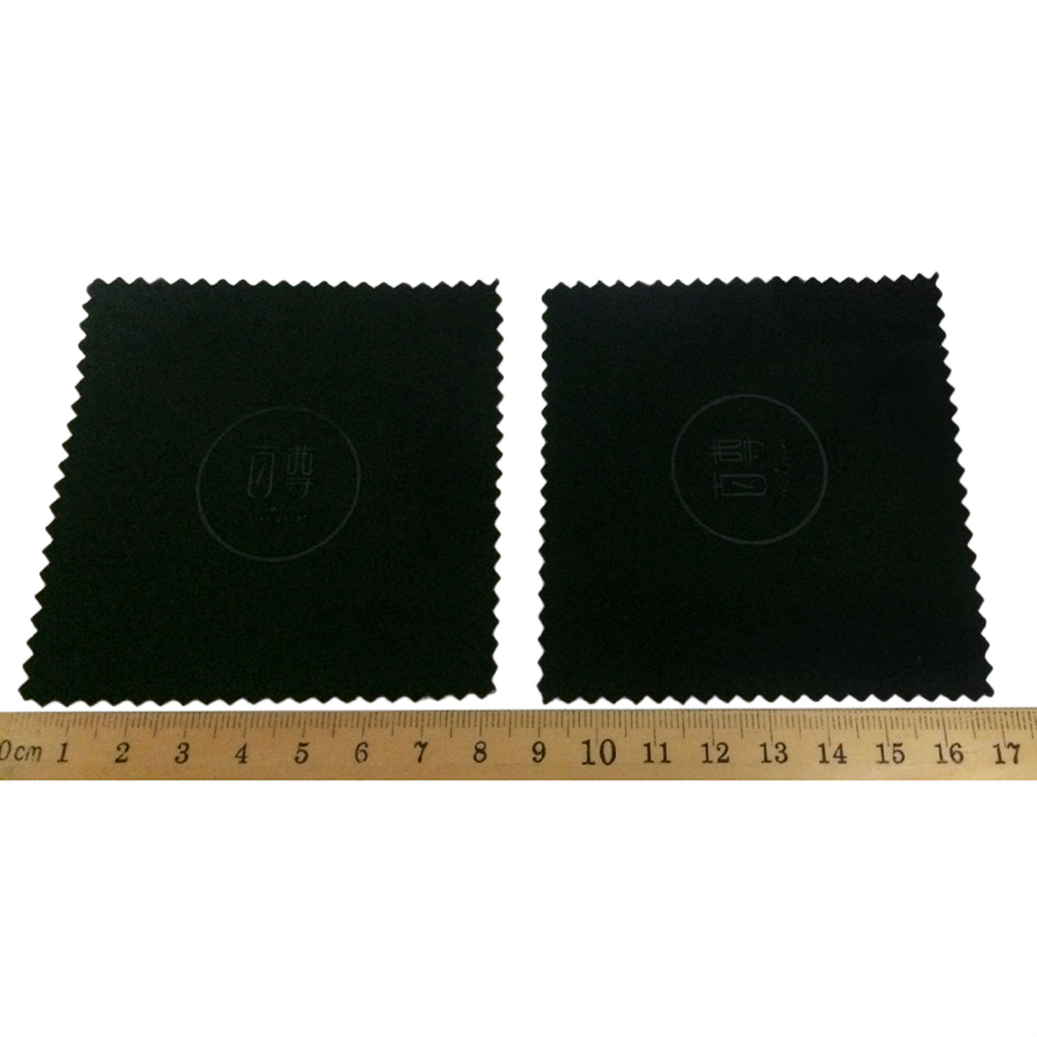 Black clean cloth displayed is made of microfiber material with silicone brand name