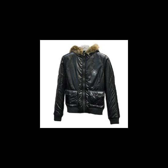 It features a fur hood, two buttoned front pockets and elastic cuffs