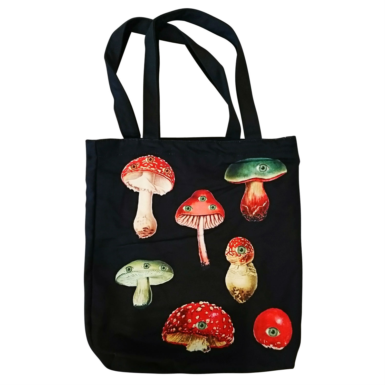 This trendy tote bag is adorned with three-eye mushroom motifs. It comes with two sturdy handles which allows easy carrying. With its large compartment, it provides storage of all your daily necessities. Carry your personal belongings around securely and comfortably with this well-made and lightweight tote bag.
