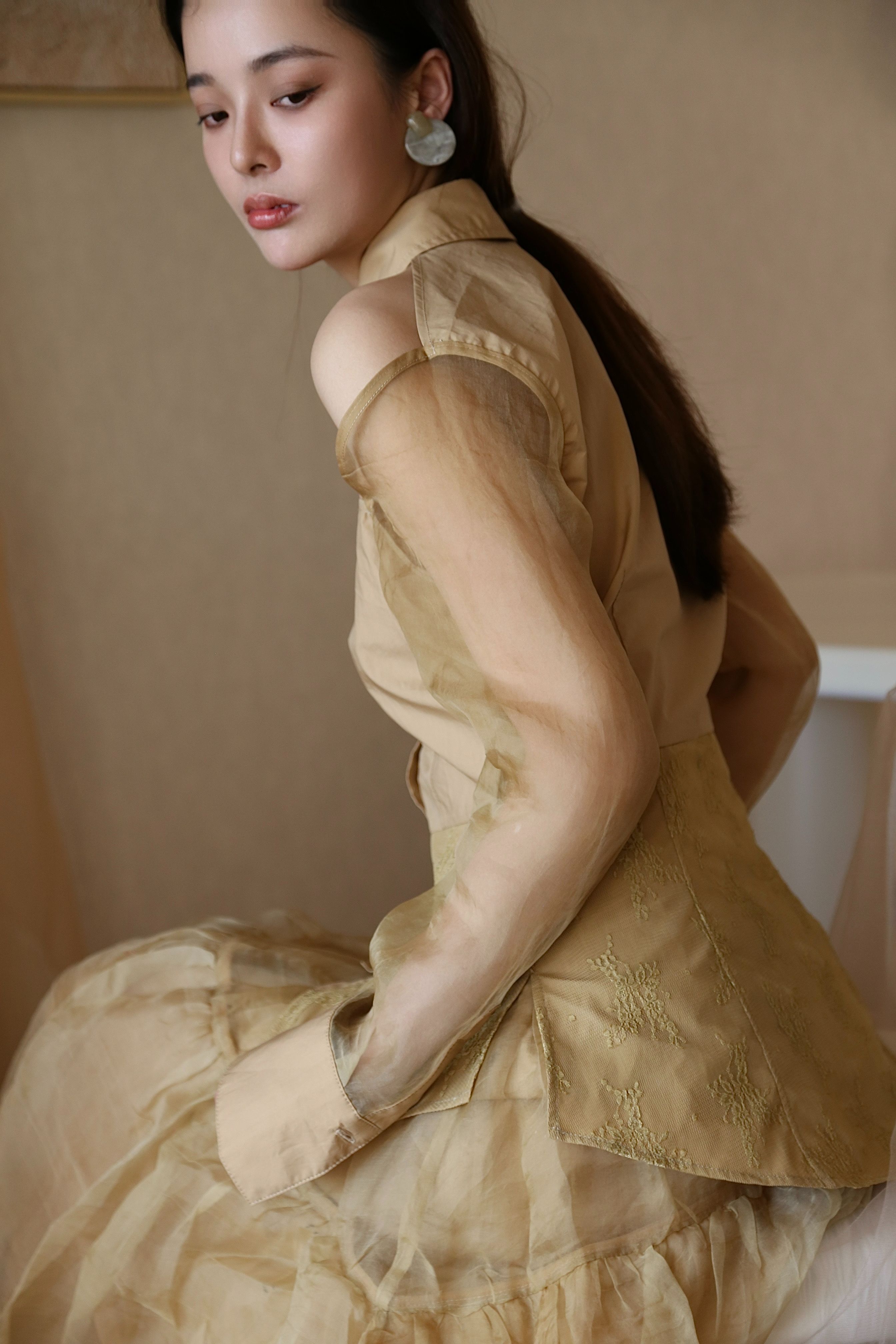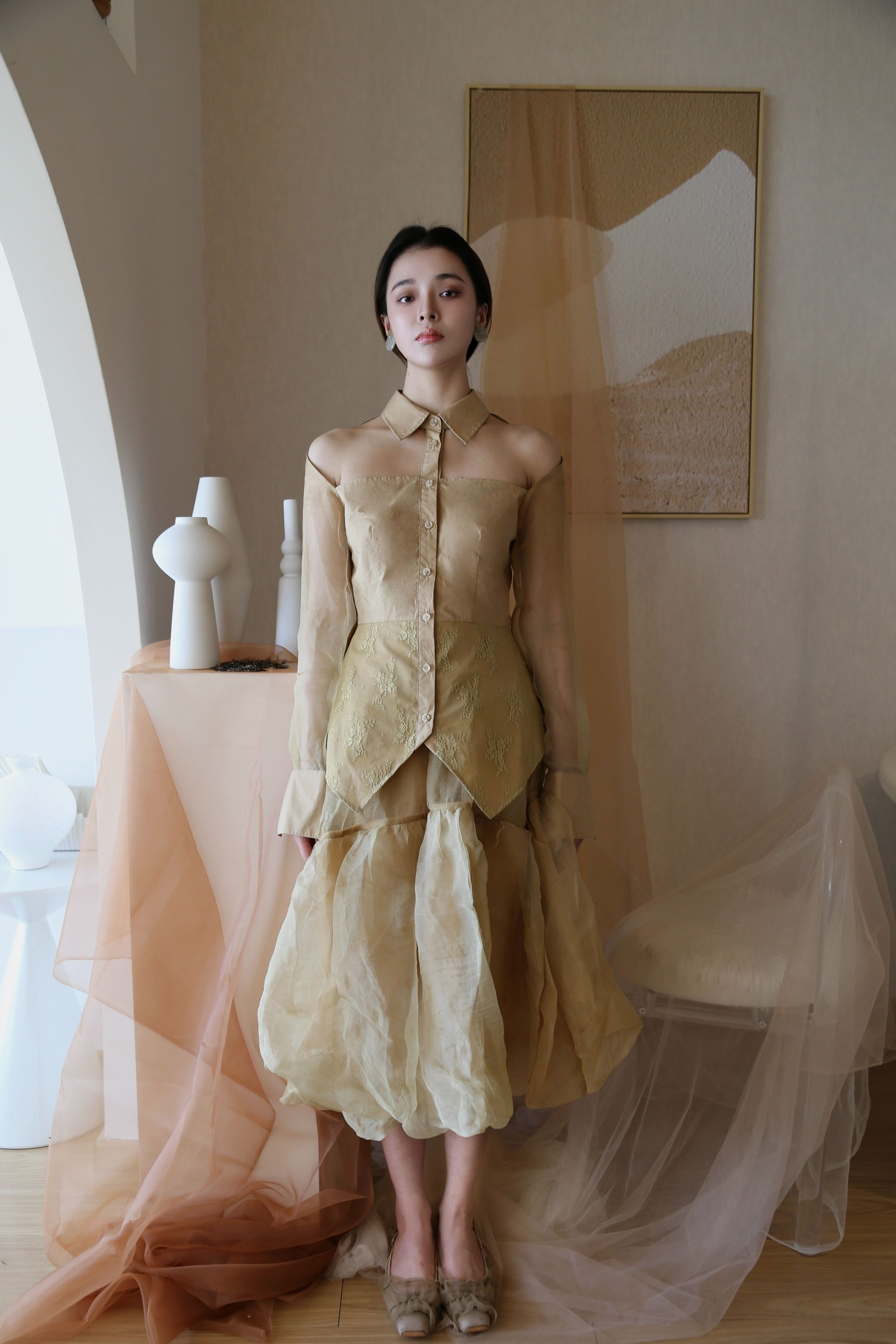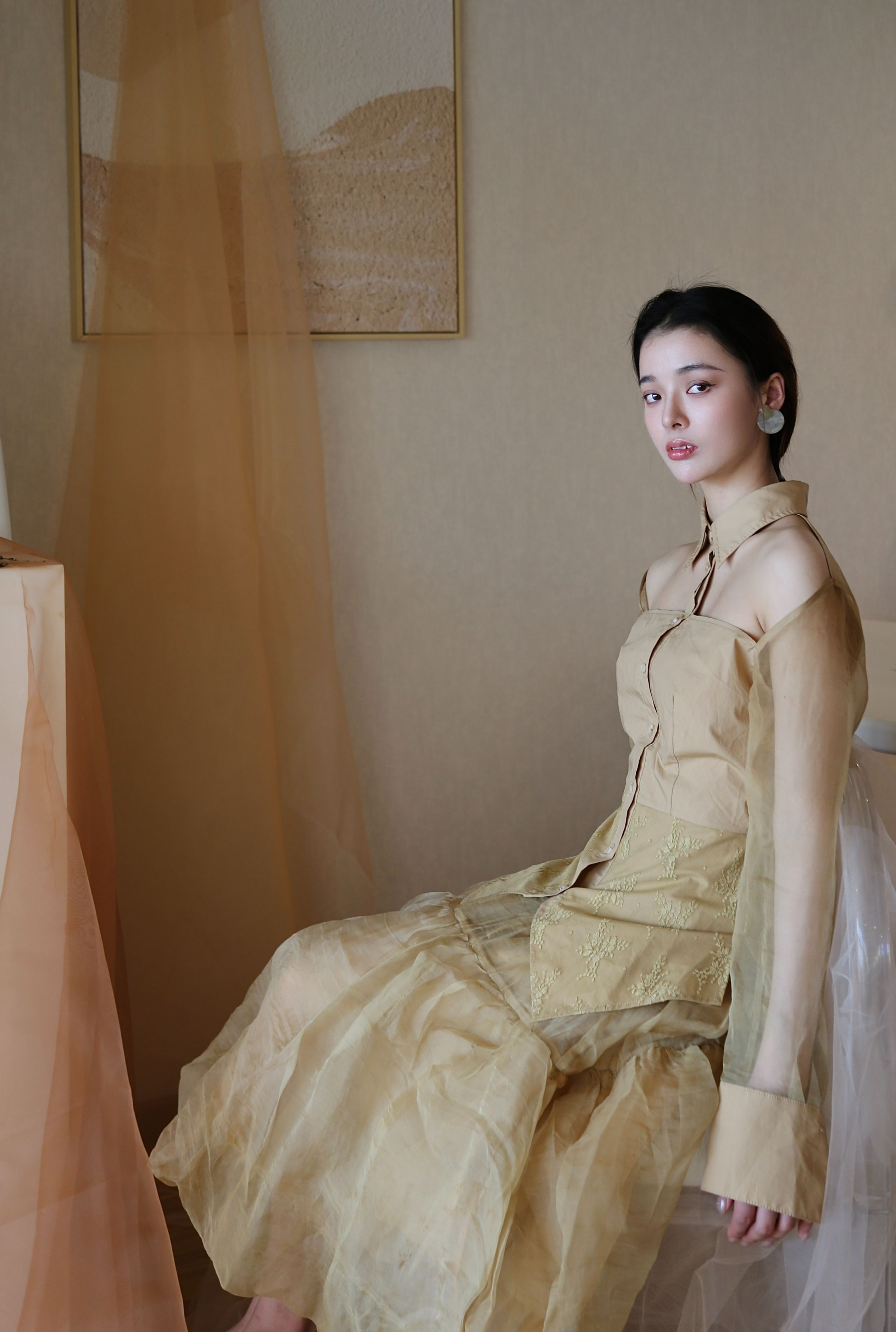 Adopting an asymmetric deconstruction design with shirt collar and shoulder opening, the chest line is divided and the waist is cut with dark embroidery to enhance the sense of lines; The outer semi transparent silk sleeve and skirt are equipped with soft light filters, making walking light and agile. Combining a sense of ceremony and everyday practicality, it is a pioneering model in the series with a high unit price, suitable for multi scene dressing, and also a visual memory item of the series.