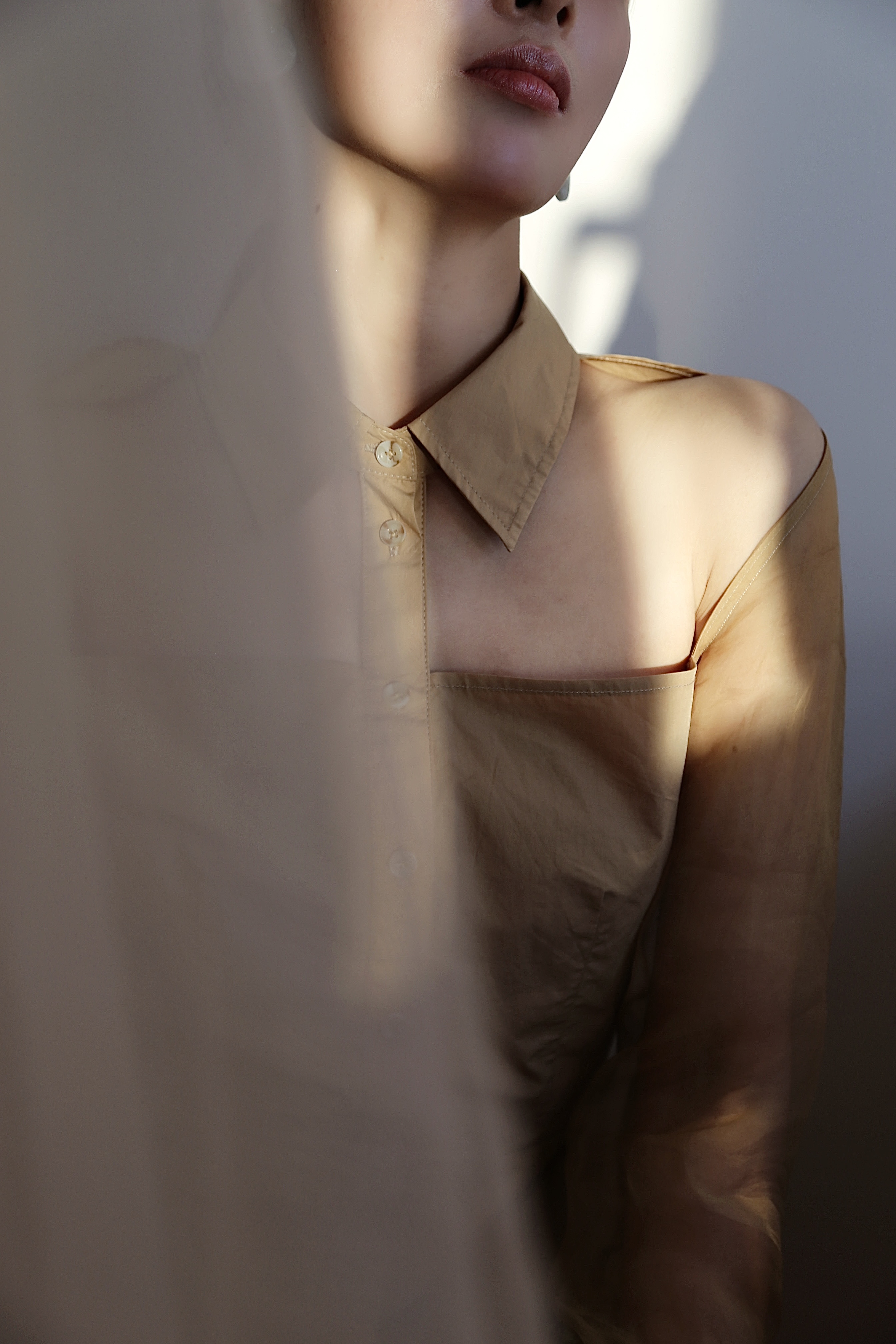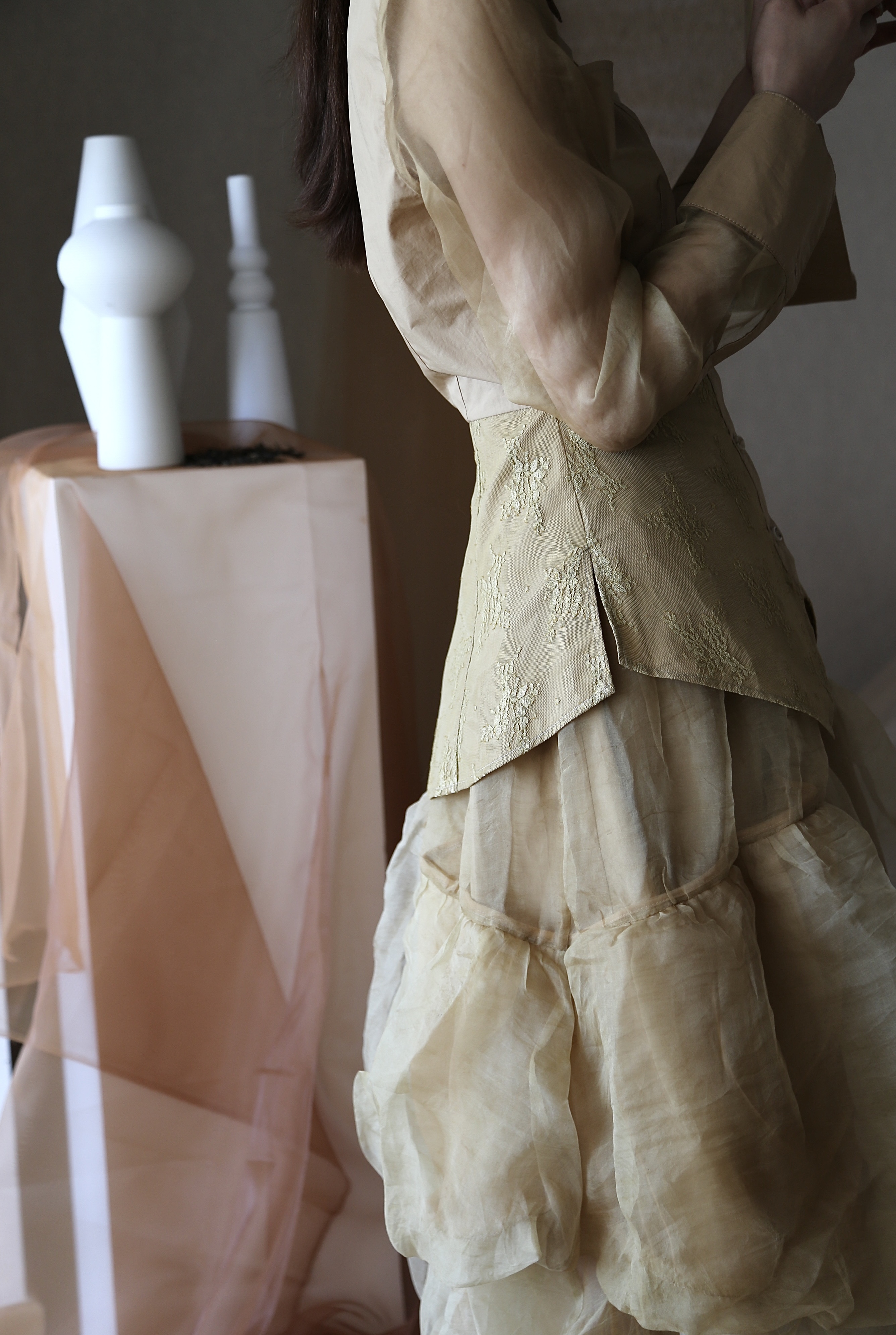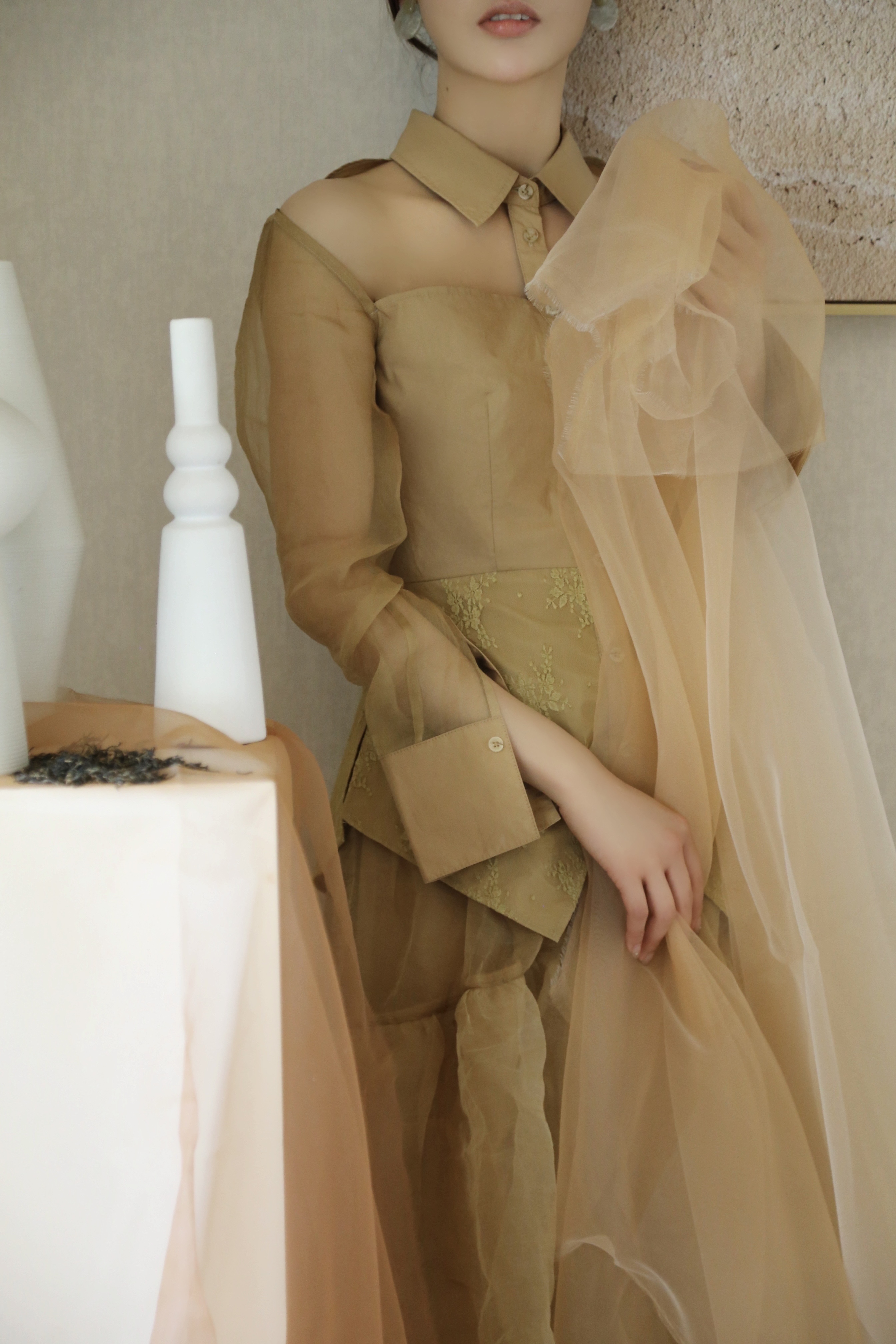 Adopting an asymmetric deconstruction design with shirt collar and shoulder opening, the chest line is divided and the waist is cut with dark embroidery to enhance the sense of lines; The outer semi transparent silk sleeve and skirt are equipped with soft light filters, making walking light and agile. Combining a sense of ceremony and everyday practicality, it is a pioneering model in the series with a high unit price, suitable for multi scene dressing, and also a visual memory item of the series.