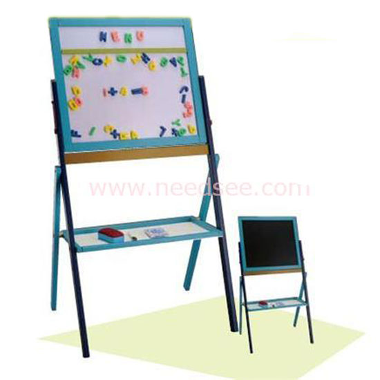 This blue blackboard is made out of wood for durability. It stands stably on the ground with four feet. This piece features a quadrilateral-shaped writing surface in an ample size.