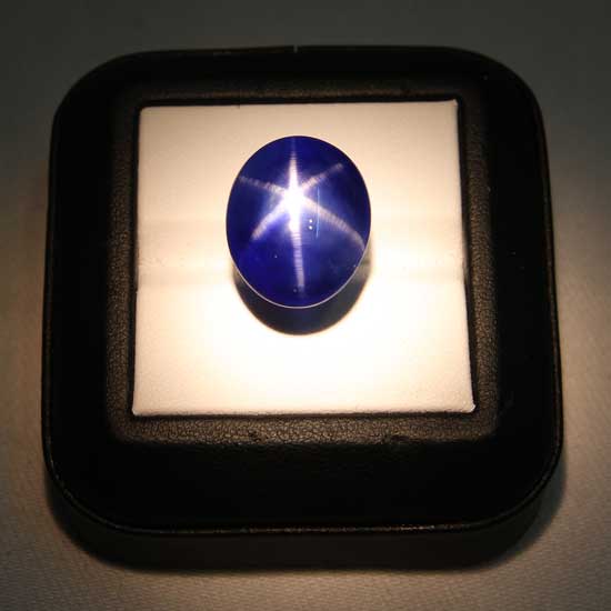 Shown here is a blue star sapphire from Ceylon. It is finely cut with delicate craftsmanship. This blue star sapphire is characterized by the breathtaking beauty.